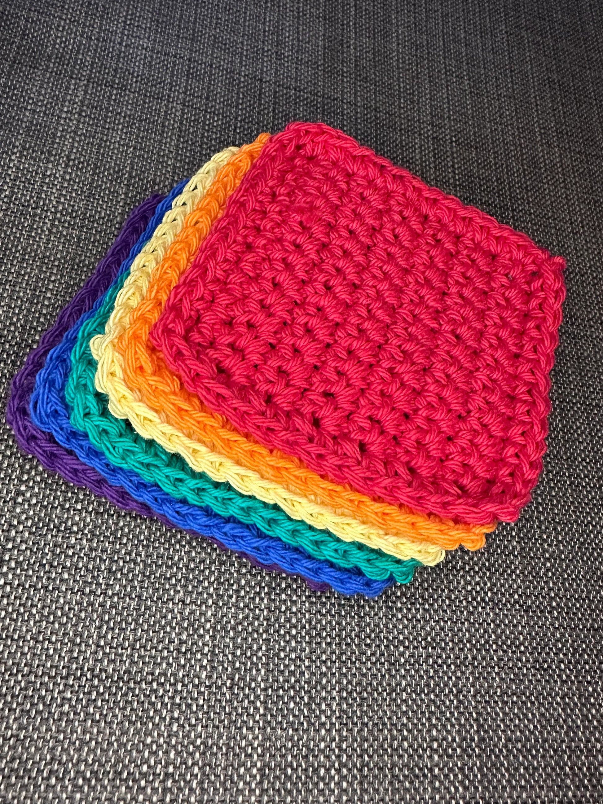 This set of 5 cotton handmade crochet coasters includes one each of red, orange, yellow, green, blue and purple.